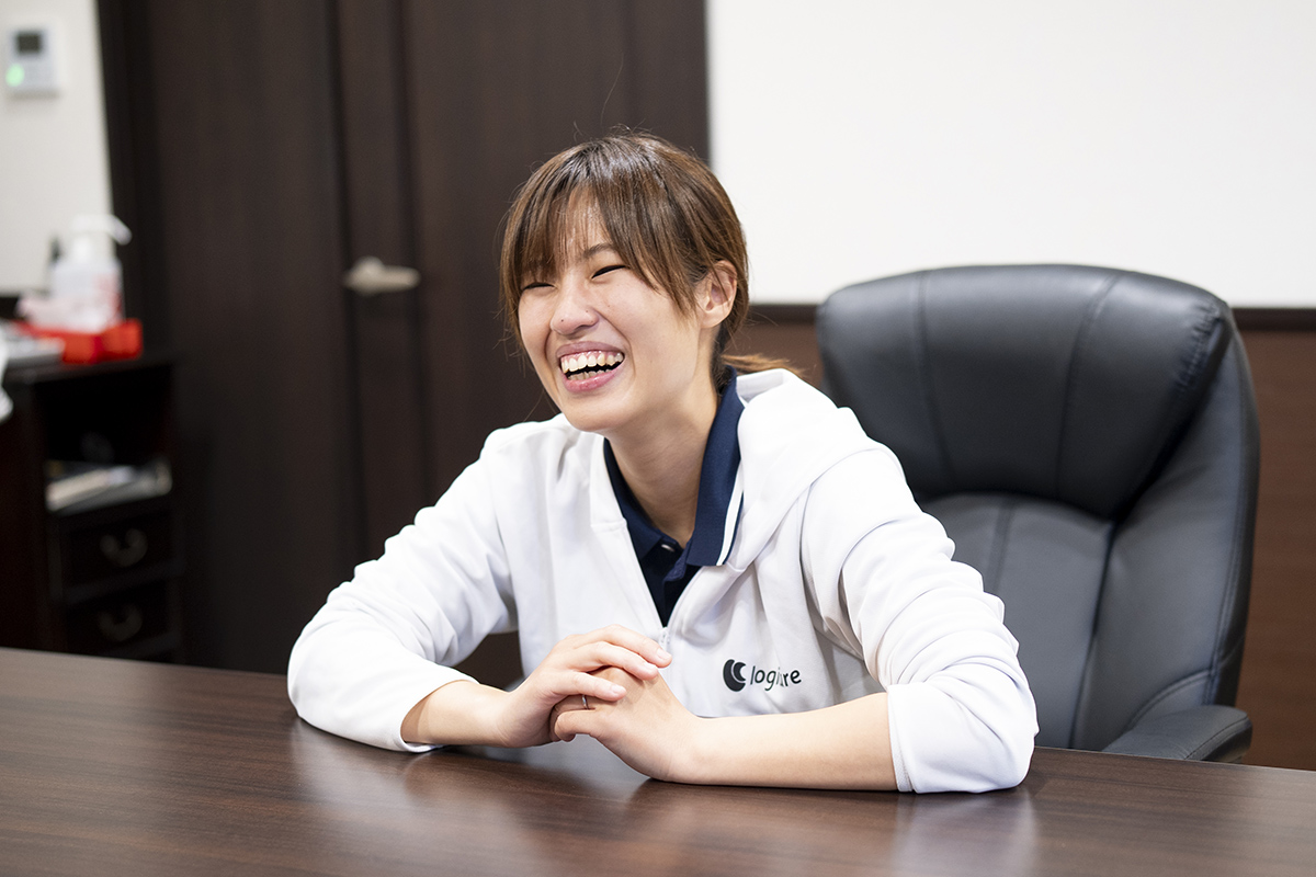 大学に企業が集まる福祉系の就職フェアでロジケアと出会いました。ブースで福祉用具に興味があることを相談すると、「福祉用具の部署があり、実際に利用者さんのお宅に入るヘルパーの視点で困りごとを理解し、それを福祉用具につなげられる」と説明を受け、興味を持ちました。営業で物を売るのではなく、現場の実感を持ってニーズを捉えられることに魅力を感じました。「一度会社においでよ」と声をかけられ、気軽な気持ちで見学に行きました。続いてヘルパーに同行する体験見学にも参加。実際に現場を見て「ヘルパーってこんな仕事なんだ」と理解できました。本社の外観も施設とは違い「介護っぽくない」おしゃれな雰囲気で、面談もフランクでした。